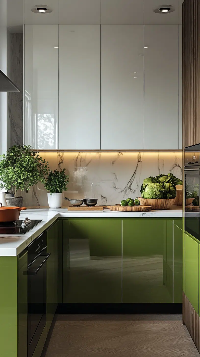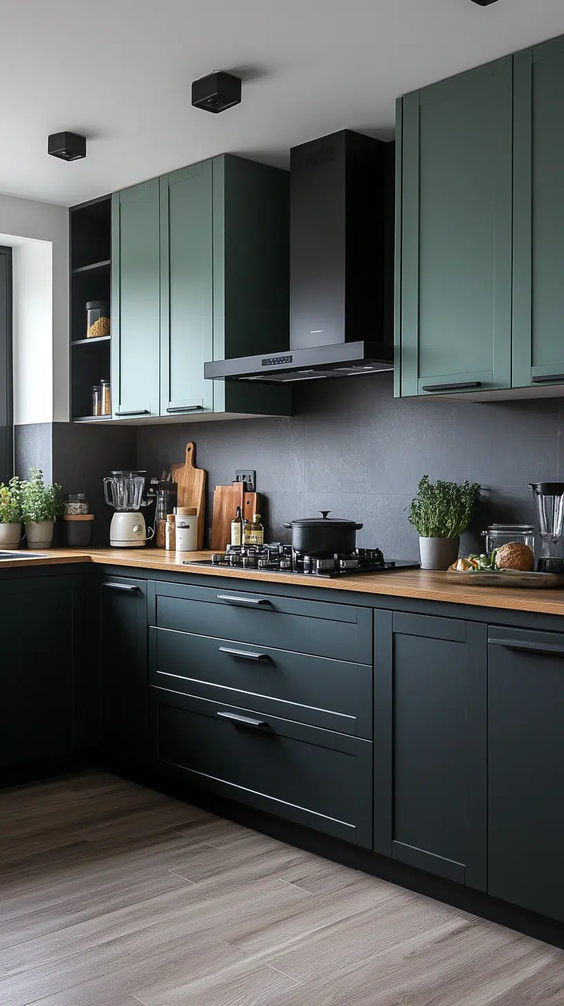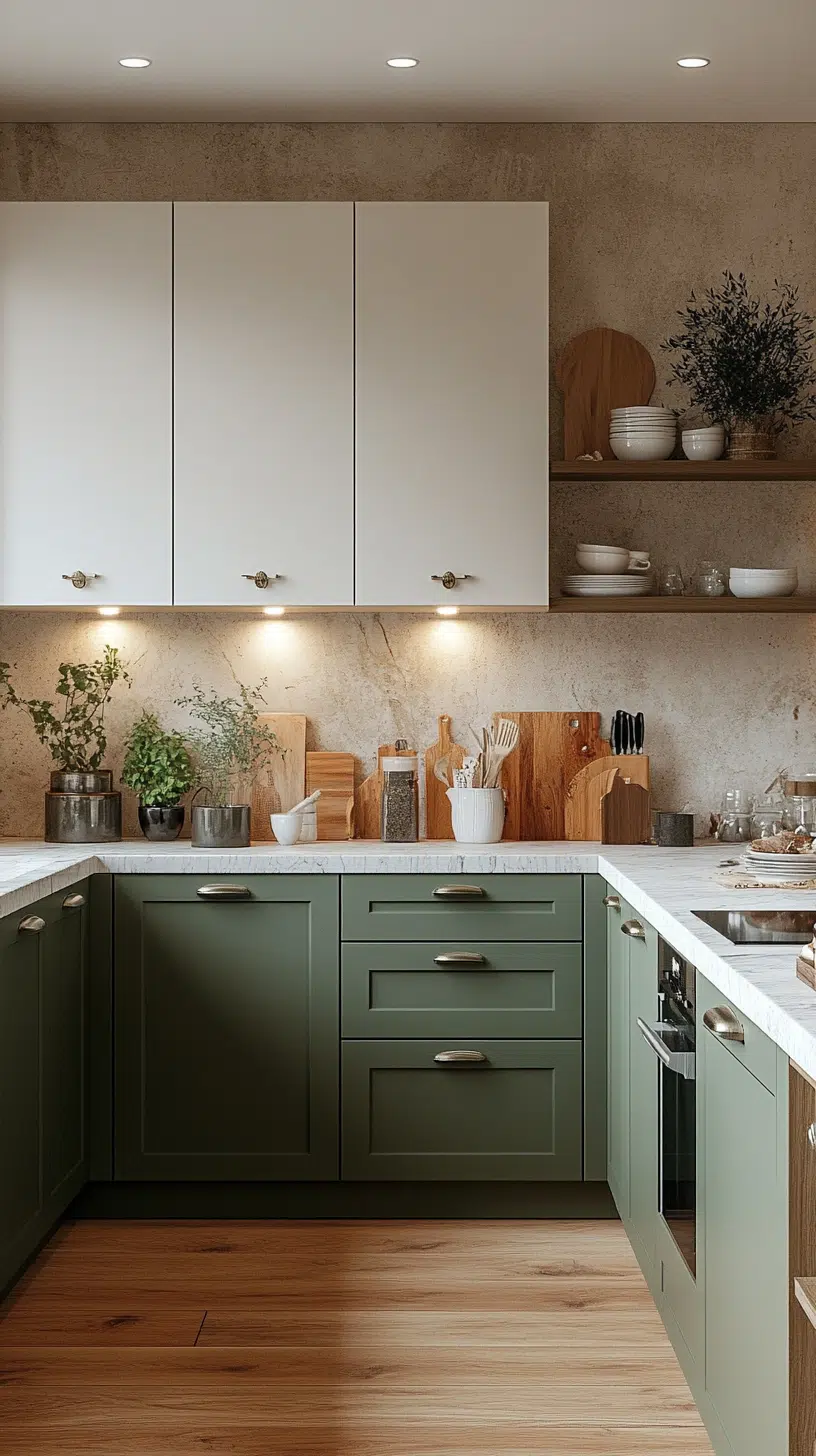 - Warm & Modern: Wood tone base + soft sage green uppers