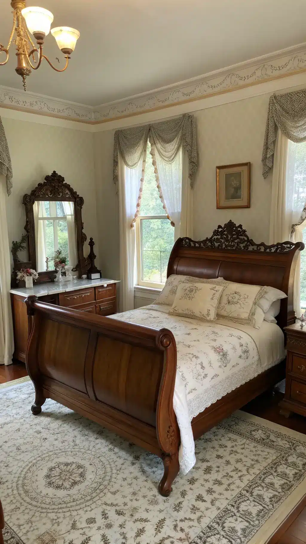 - Textures: Rich woods, delicate lace, warm brass accents