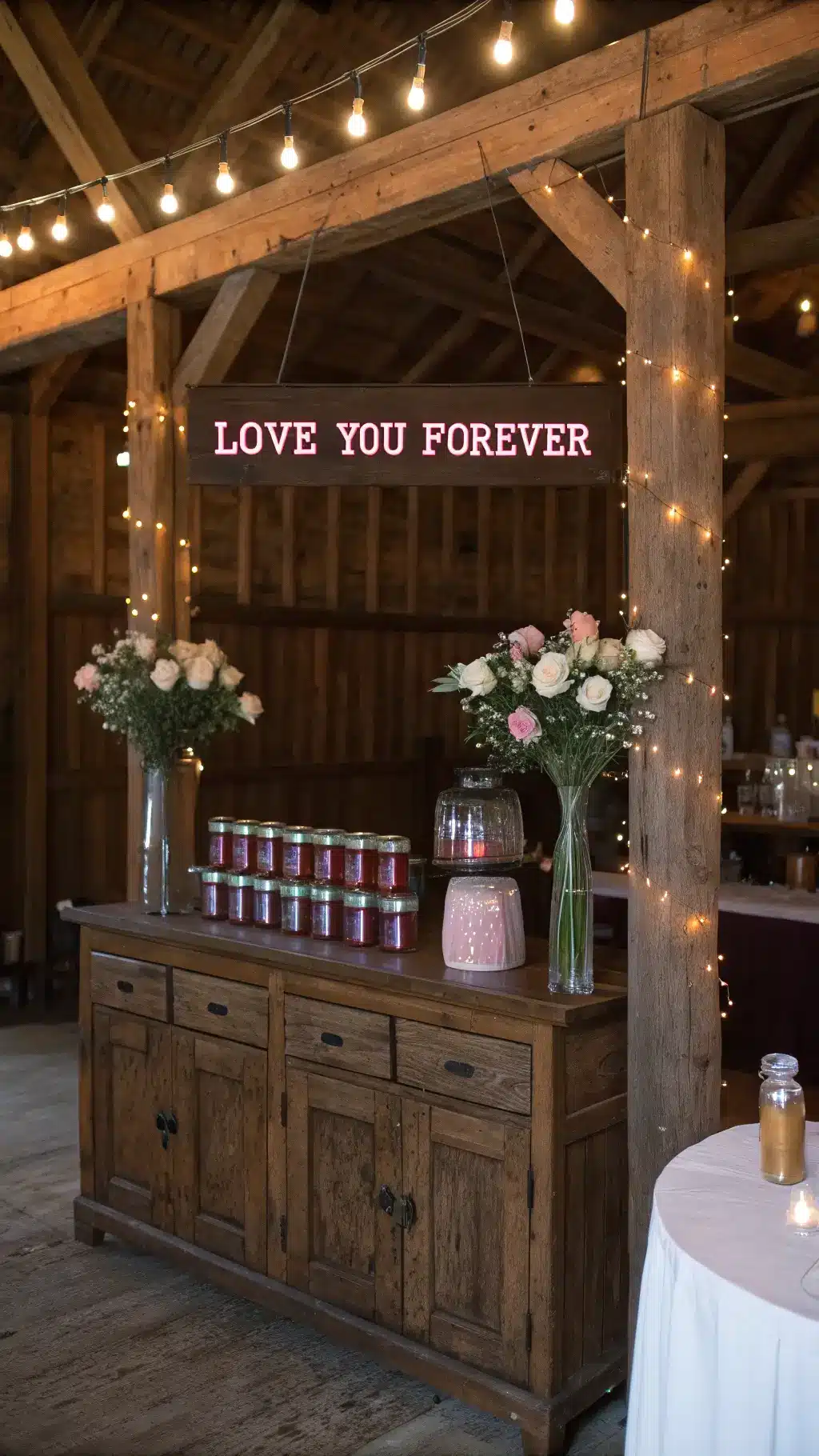 For drinks stations, we set up vintage drink dispensers in an old wooden cabinet we found at a thrift store for $40.