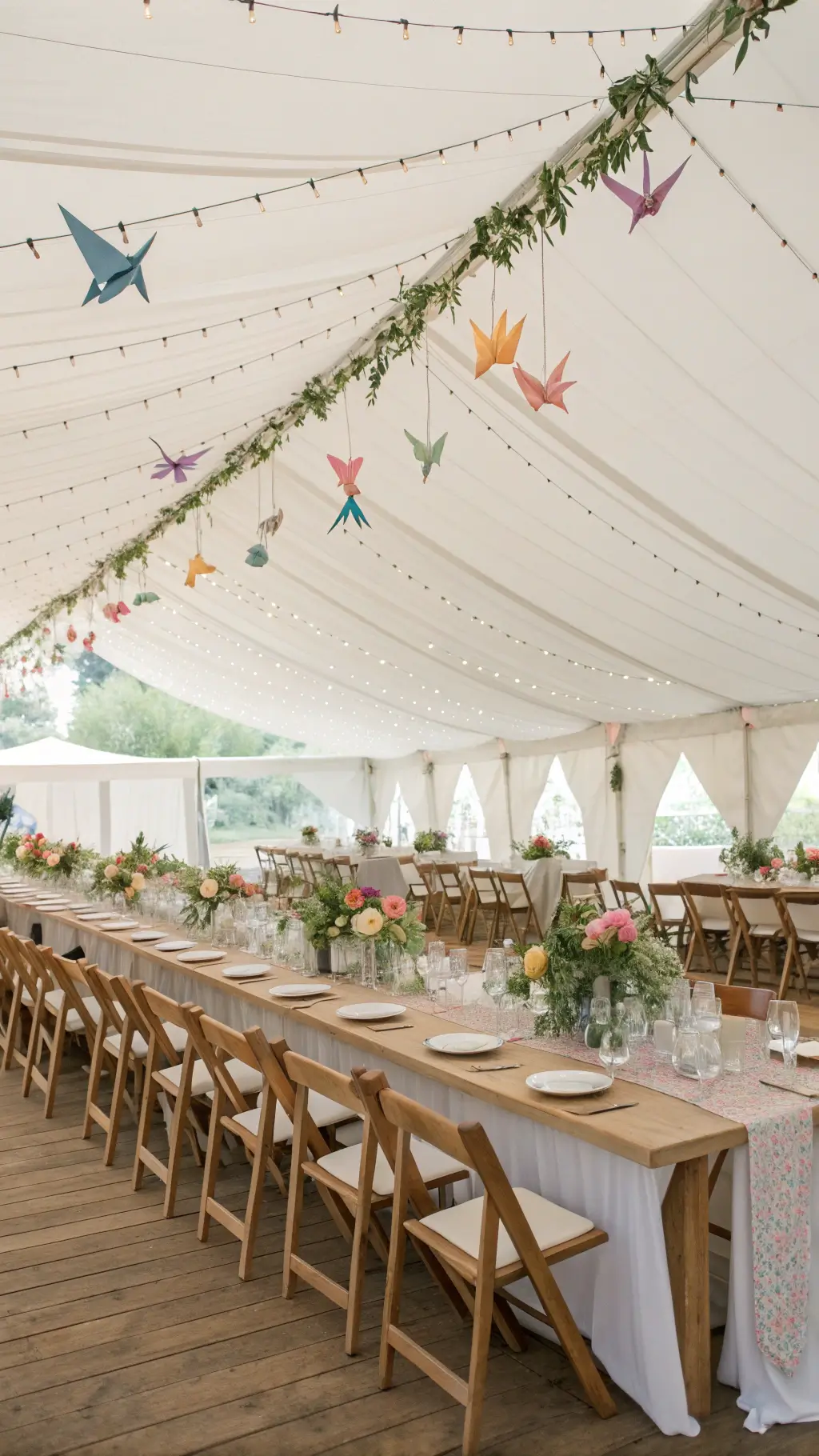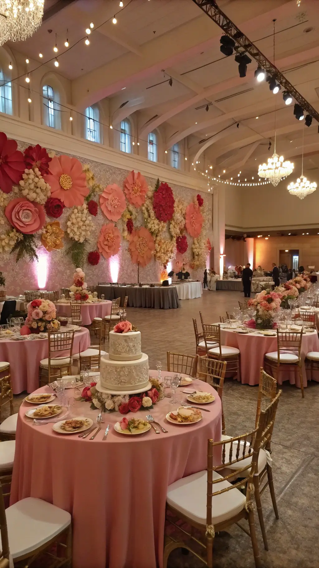 Picture walking down an aisle lined with oversized paper flowers while rainbow-colored ribbons dance in the breeze.