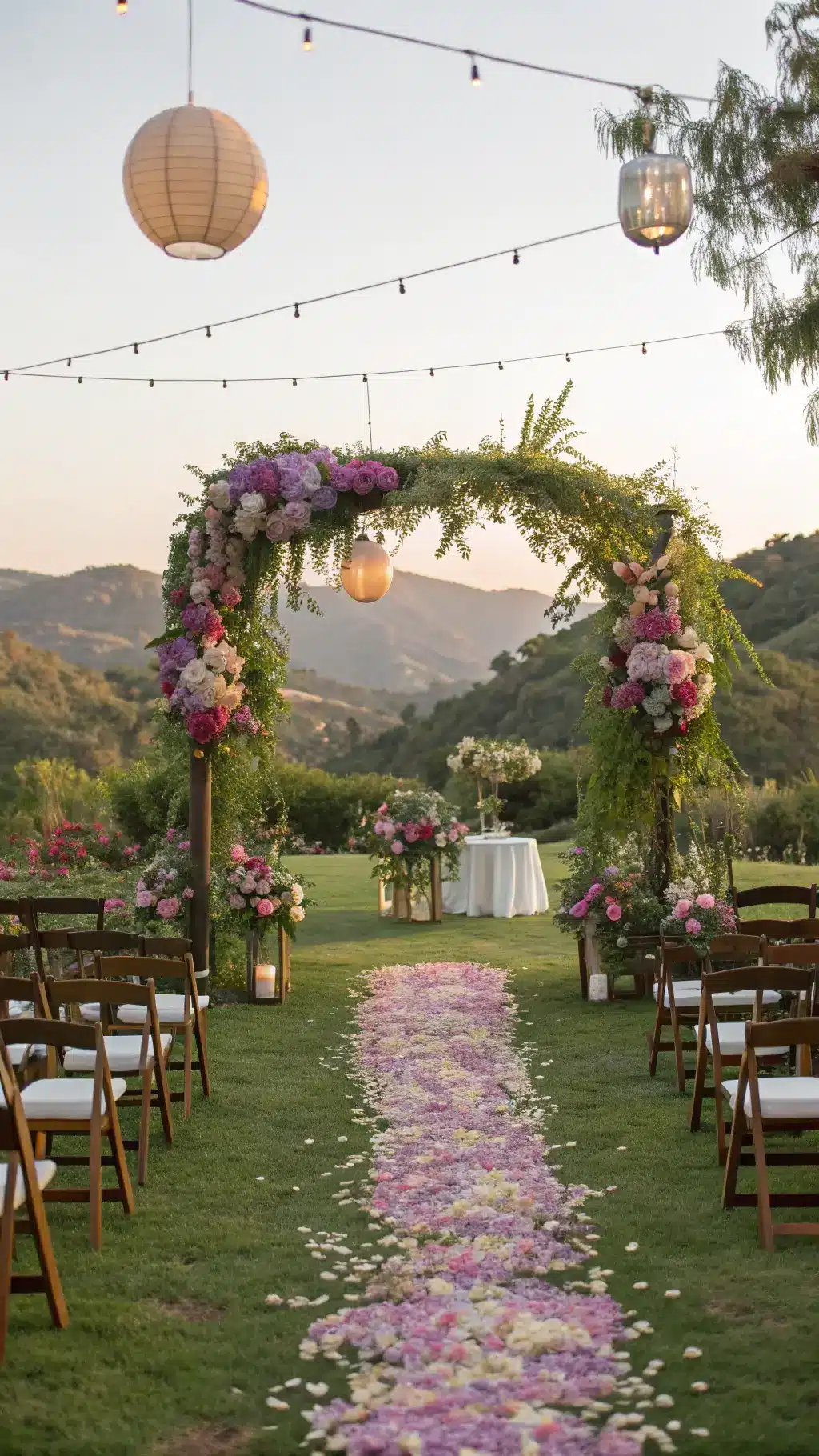 - A ceremony arch dripping with wildflowers and trailing ribbons